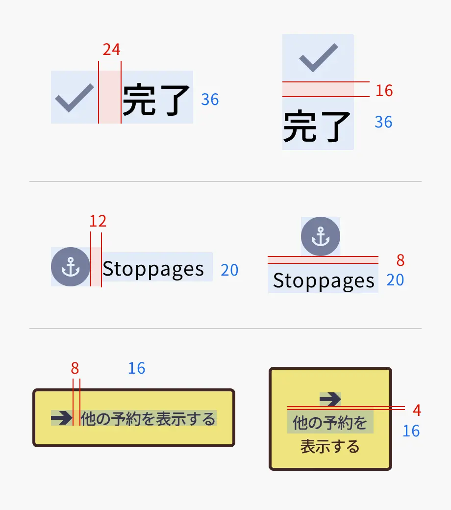 もしテキストサイズリストにないサイズを使用する場合は、テキストの高さ(px数)を基準として、0.5~0.7倍程度の余白を設けてください。(アイコンのサイズや配置の縦横に関係なく)