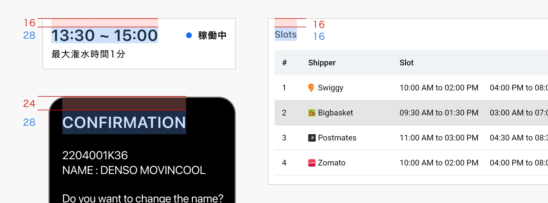 デザインシステム内のテキストサイズリストから用いる場合は、下記の対応表を確認し余白を選択してください。