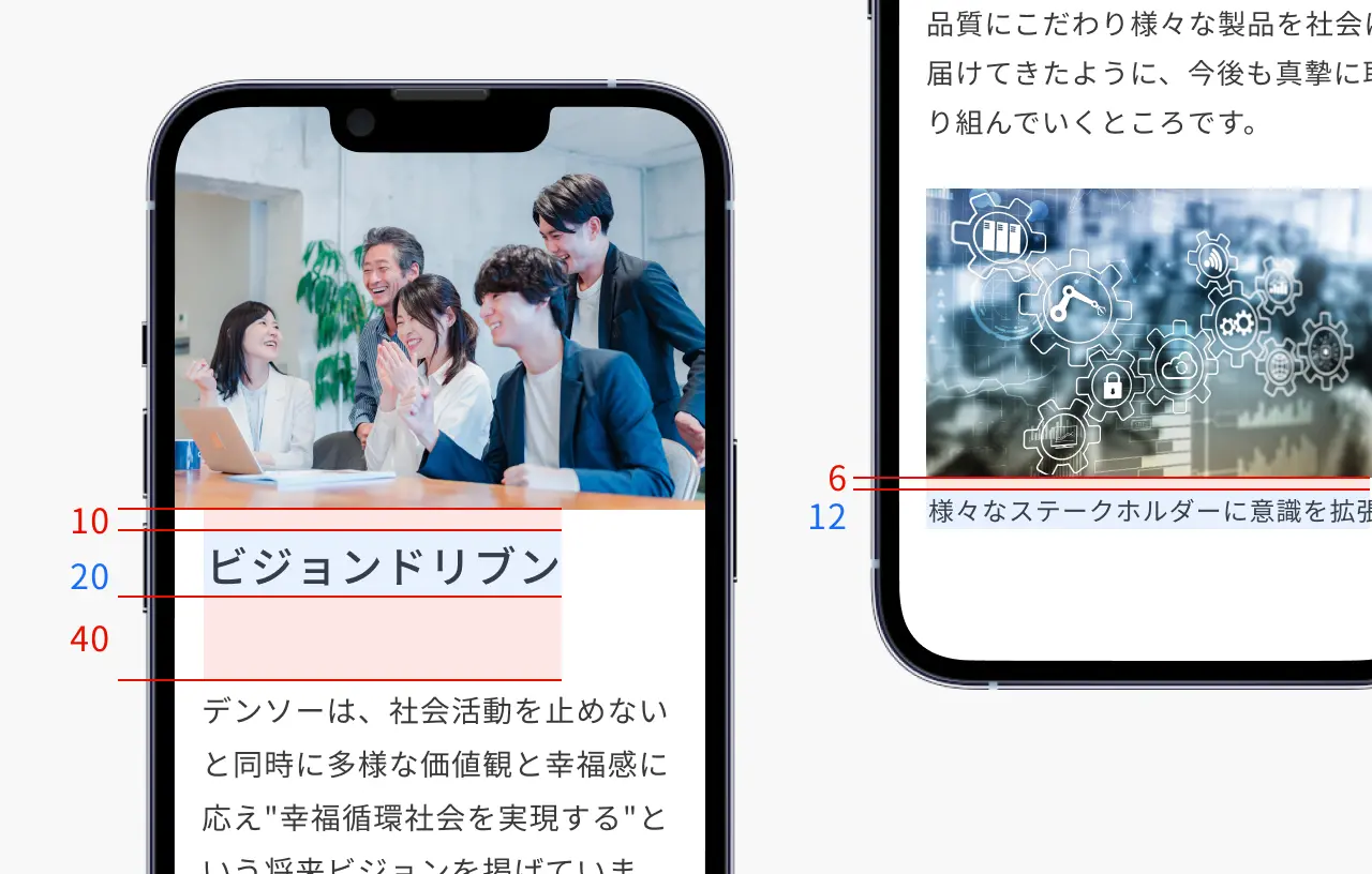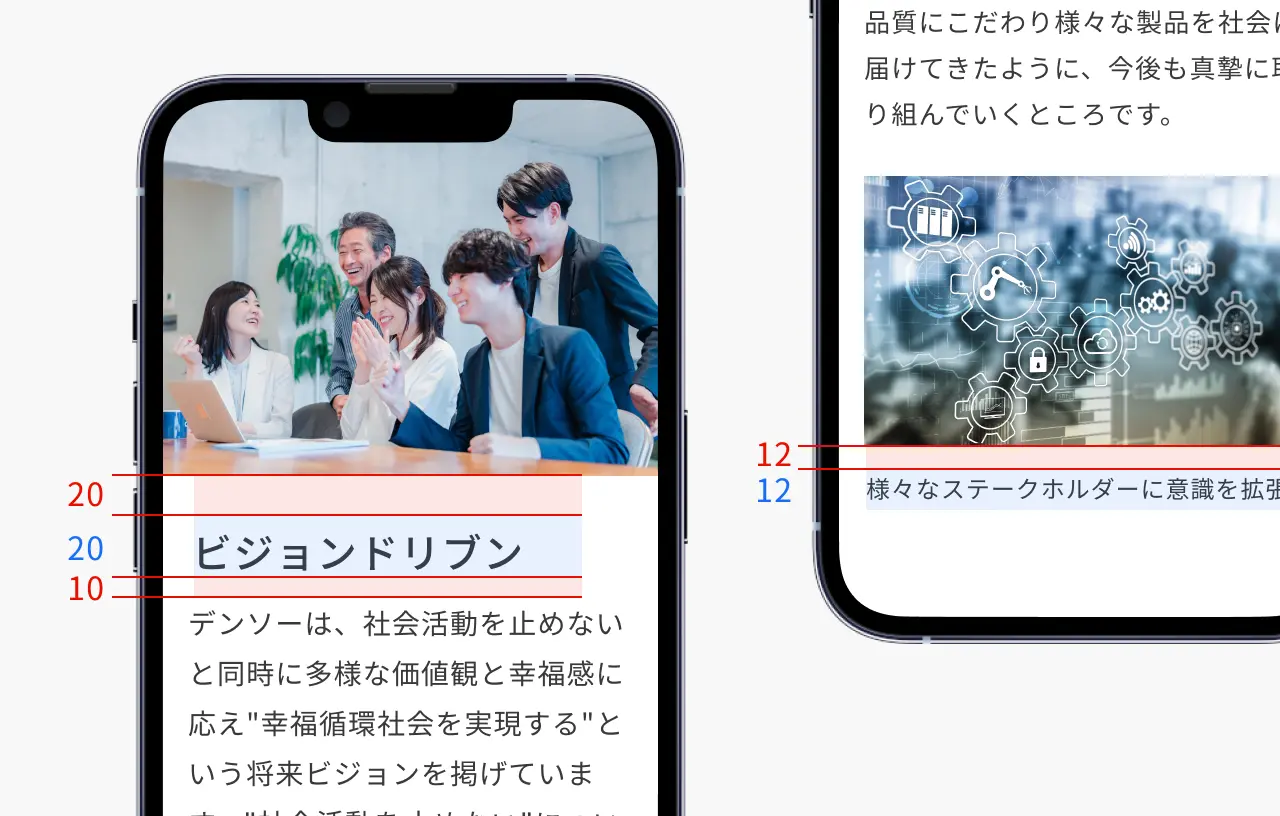上記の余白を用いて要素間の情報に関係性があることを伝える、もしくは各要素を目立たせる適度な余白を設けてください。各要素間の余白について下記にある設定方法をご覧ください。