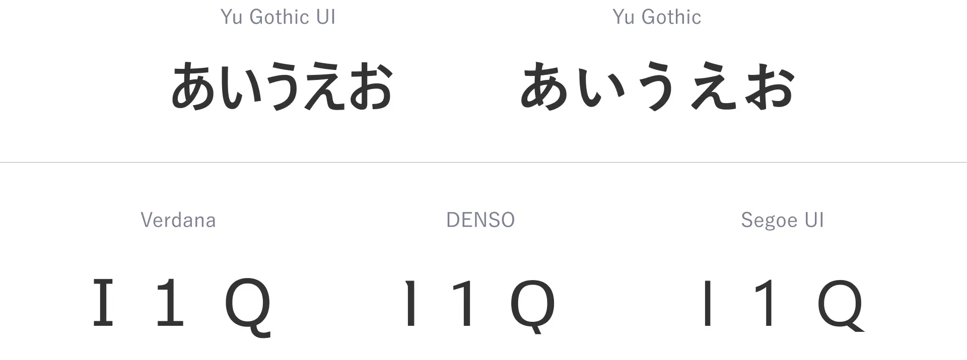 また、英文については、VerdanaよりもSegoe UIの方がDENSOフォントに近いセリフ形状をしているので、DENSOフォントとの相性を鑑みSegoe UIを推奨します。