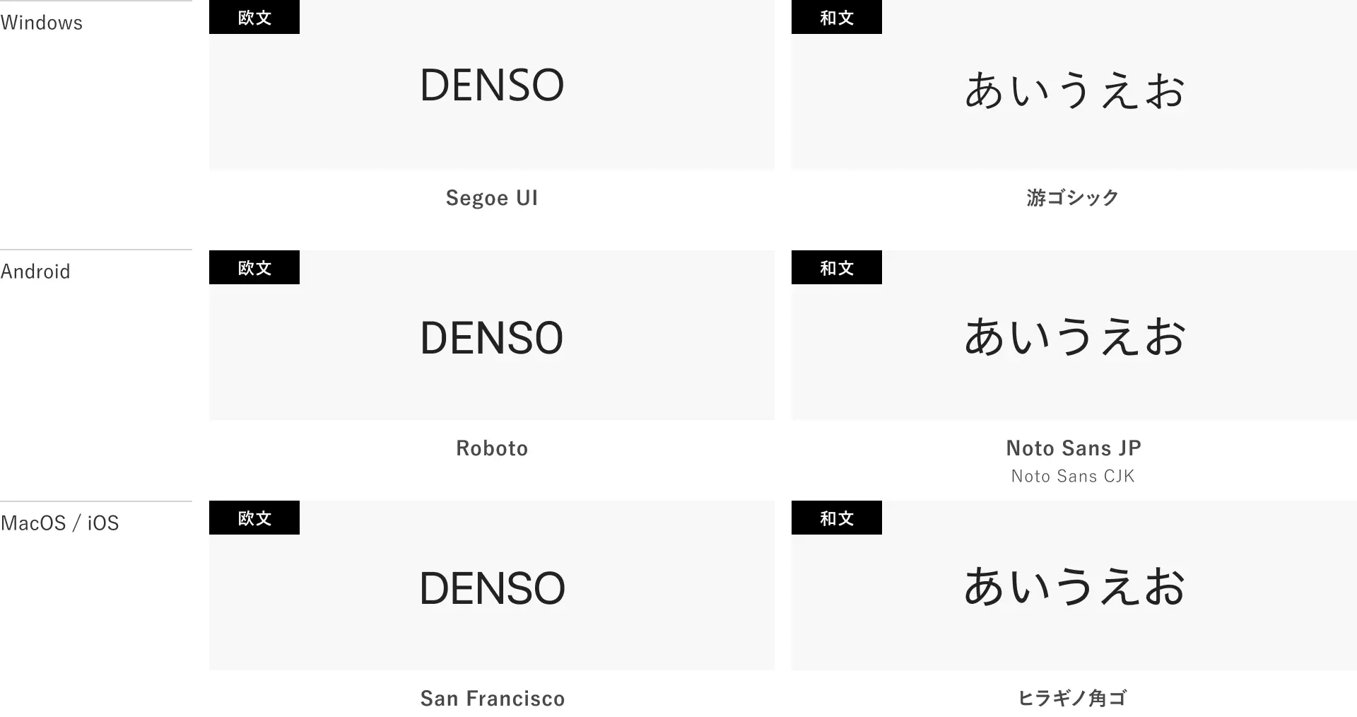 現状のデンソーCISに設定されているコーポレートフォントだけではなく、各実装環境に最適化されたシステムフォントを使用することで機能的メリットを享受できます。